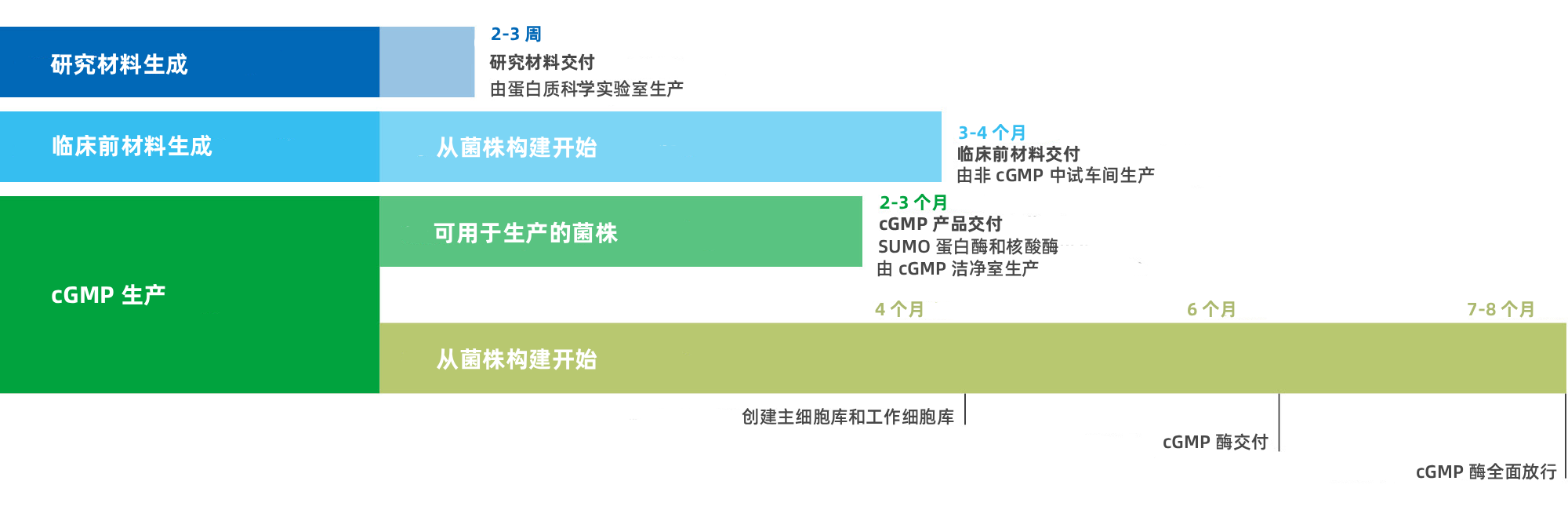 • 加速项目进程: 在遵循最高质量标准的前提下,2 至 3 周内获得研究材料,3 至 4 个月内获得临床前材料,7 至 8 个月内实现动态药品生产管理规范 (cGMP) 级酶生产。