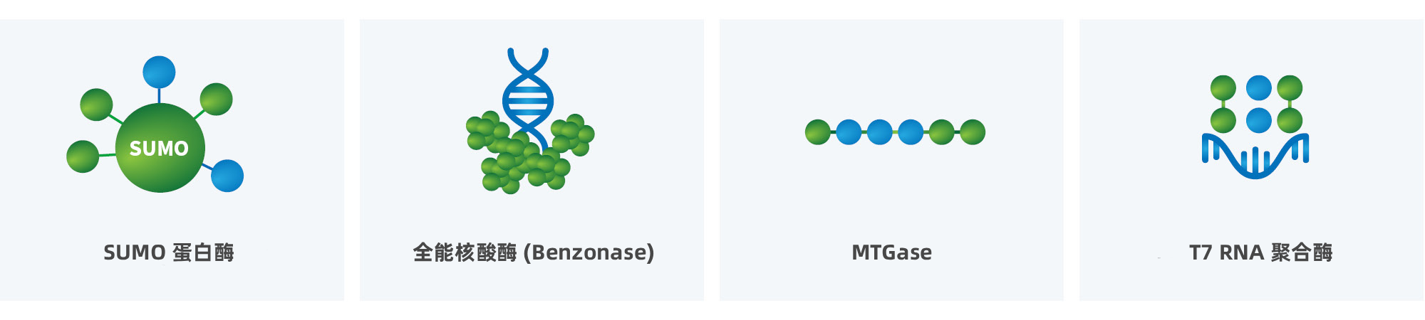 我们可提供以下工具酶及其他多种产品。SUMO 蛋白酶可促进蛋白质回收,全能核酸酶 (Benzonase) 可去除不需要的核酸,微生物谷氨酰胺转移酶(MTGase)可用于蛋白质的精确偶联;T7 RNA聚合酶则可用于分子生物学应用中的高效序列合成。