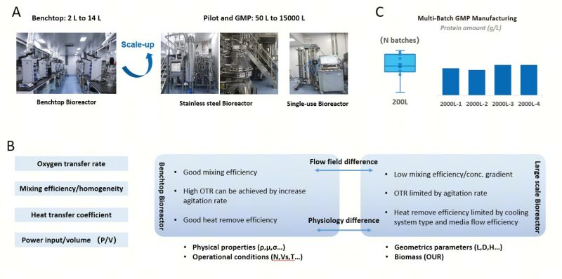 (C)稳健放大至GMP厂房及批次间性能一致性的案例研究。