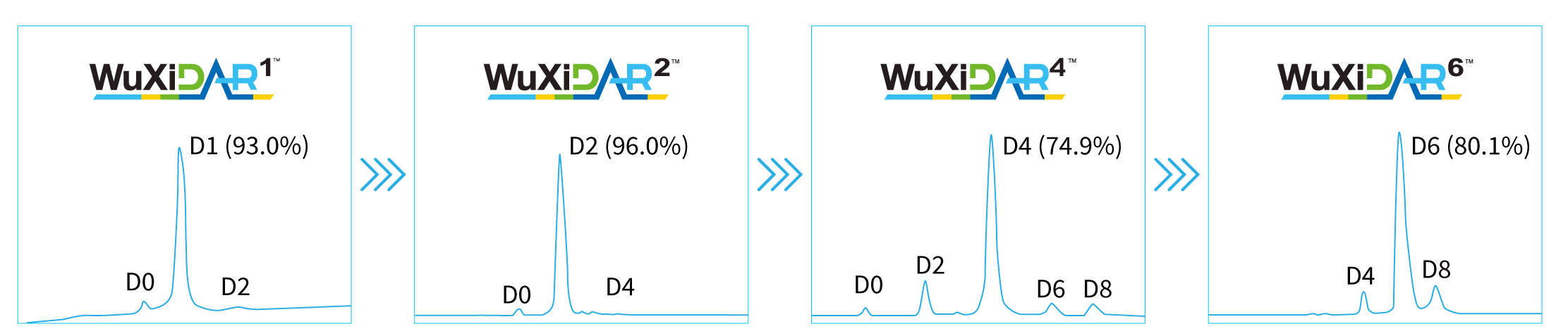 针对传统半胱氨酸偶联技术均一性欠佳的痛点,药明合联研发了WuXiDARx™技术*,一种基于抗体天然半胱氨酸残基的偶联方式。运用WuXiDARx™偶联技术制备基于链间二硫键残基偶联的生物偶联药时,可有效控制产品中非目标DAR值组分的含量,确保其控制在一个较低水平,使得生产出的生物偶联药具有优异的同质性。该技术可供自由选择不同目标DAR值(DAR1, DAR2, DAR4与DAR6),为生物偶联药管线开发提供了更高的灵活性。WuXiDARxTM技术极大的拓宽了生物偶联药的组合可能性,并助力推动生产模式的技术升级。